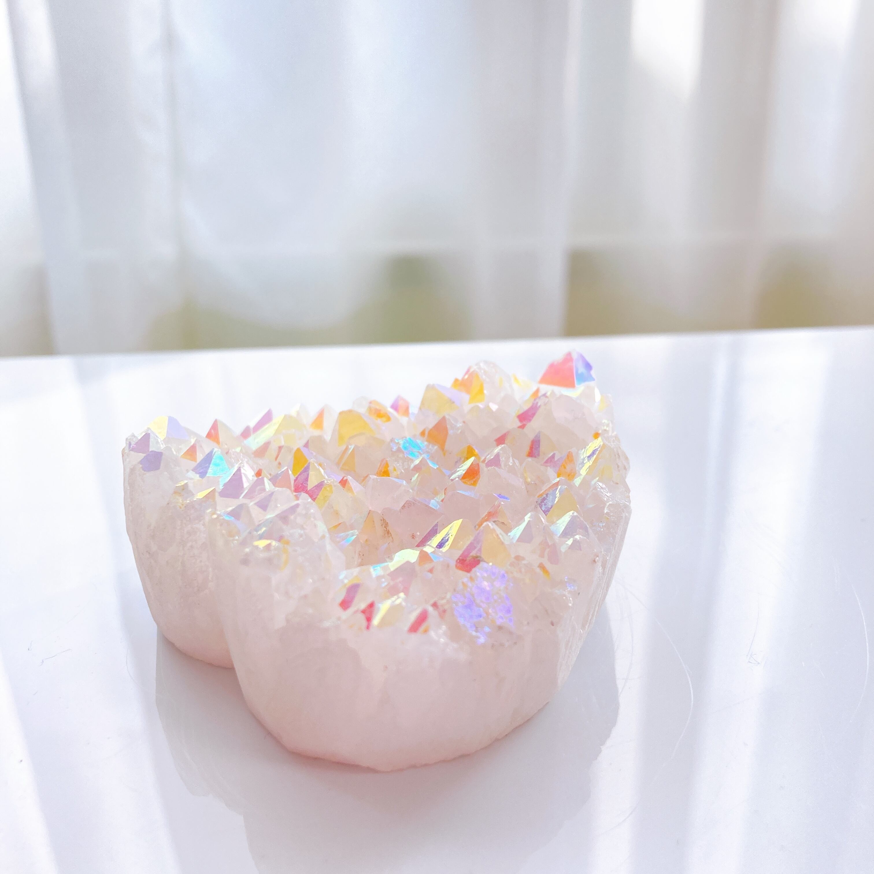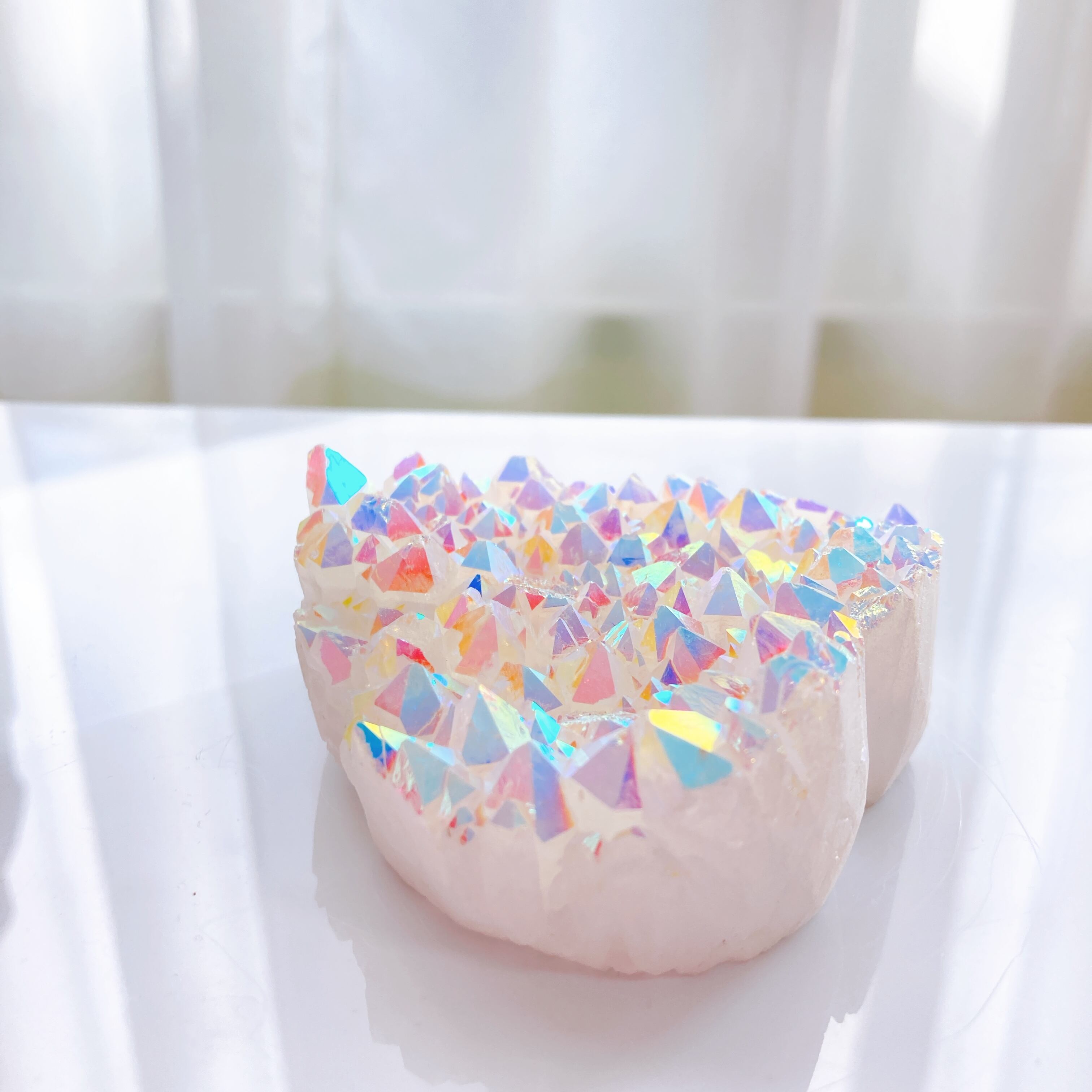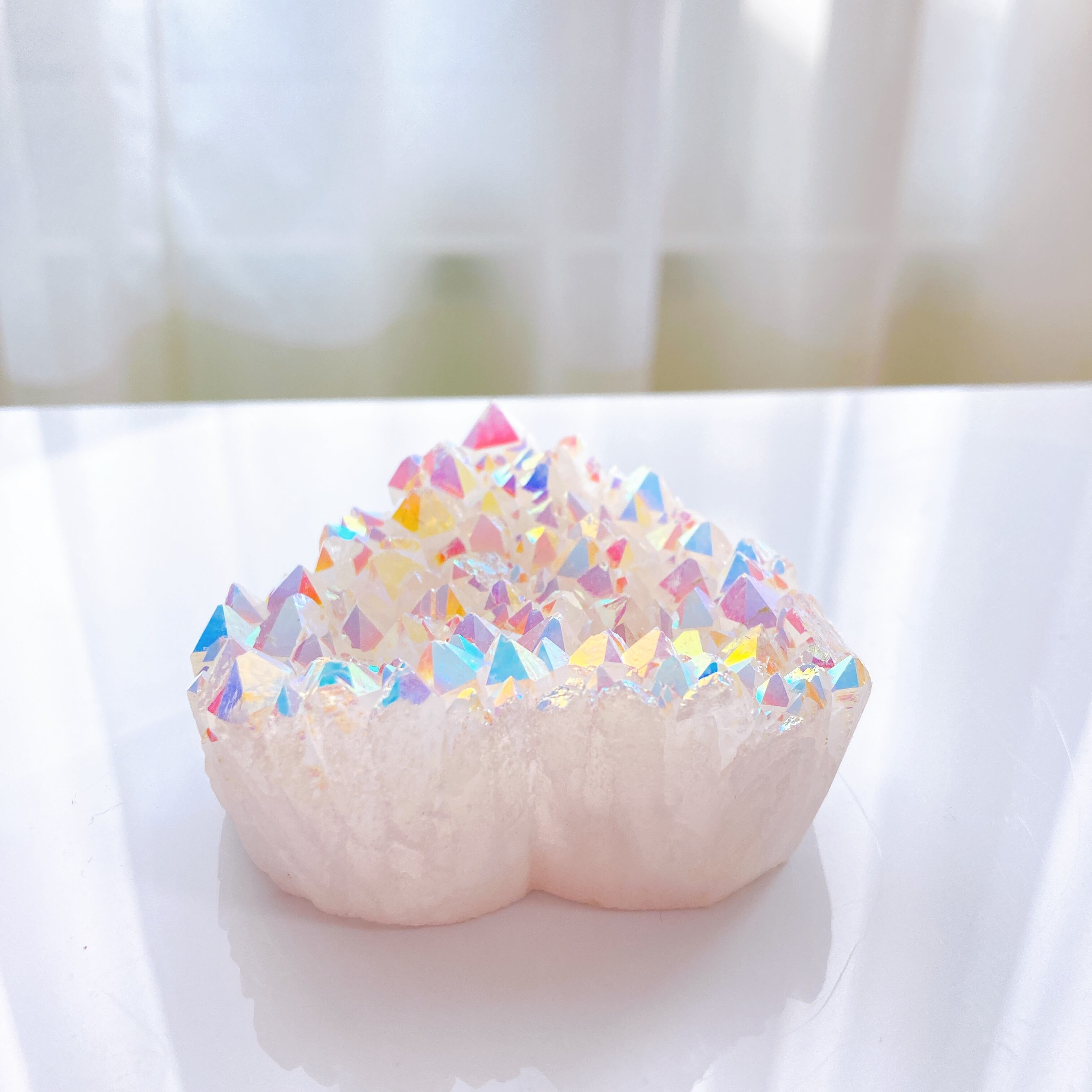天然水晶に、チタン(銀の場合もあり)を蒸着コーティングする事で作られたものになります。金属を高温に加熱して蒸発させてから、時間をかけて吸着させることで透明感のあるレインボーの輝きが生まれます。