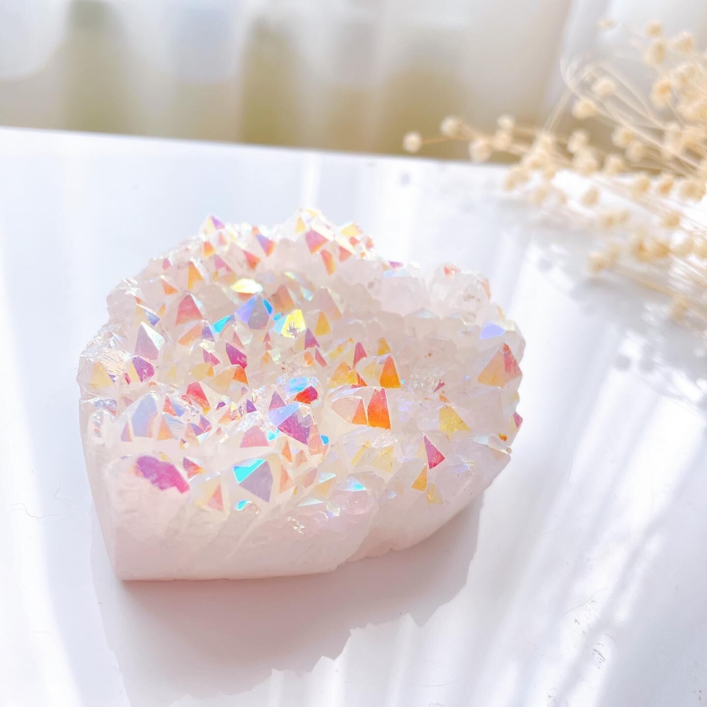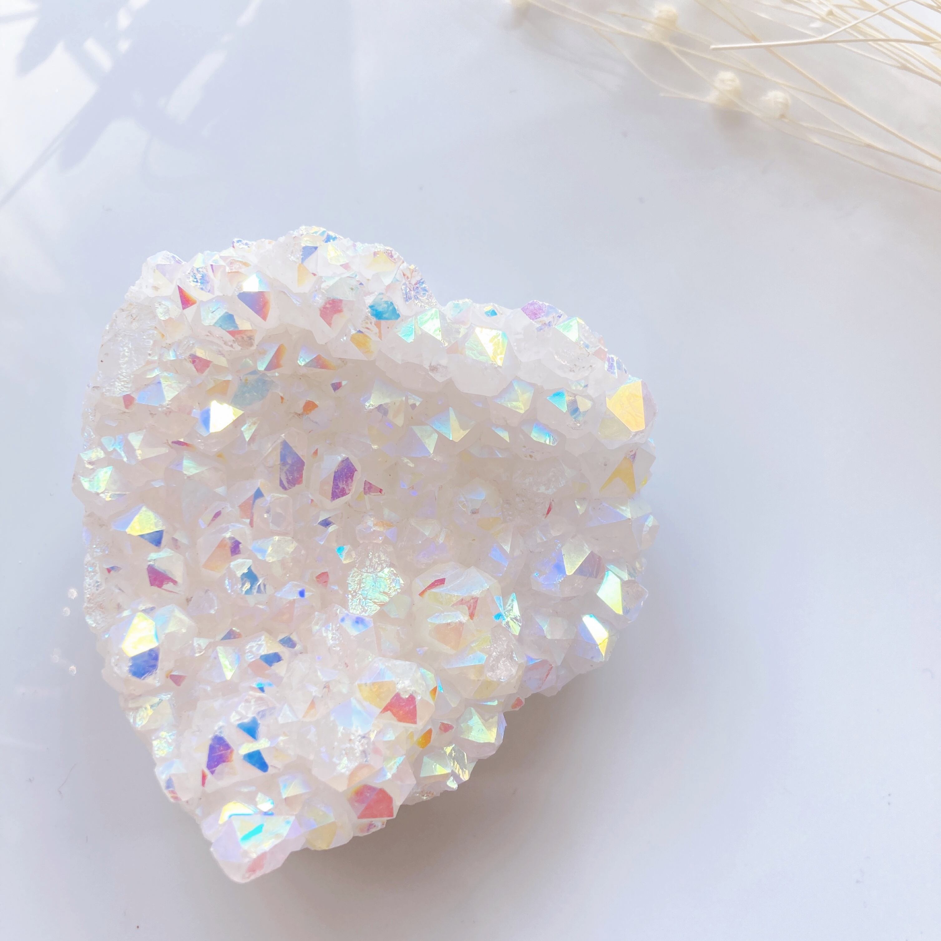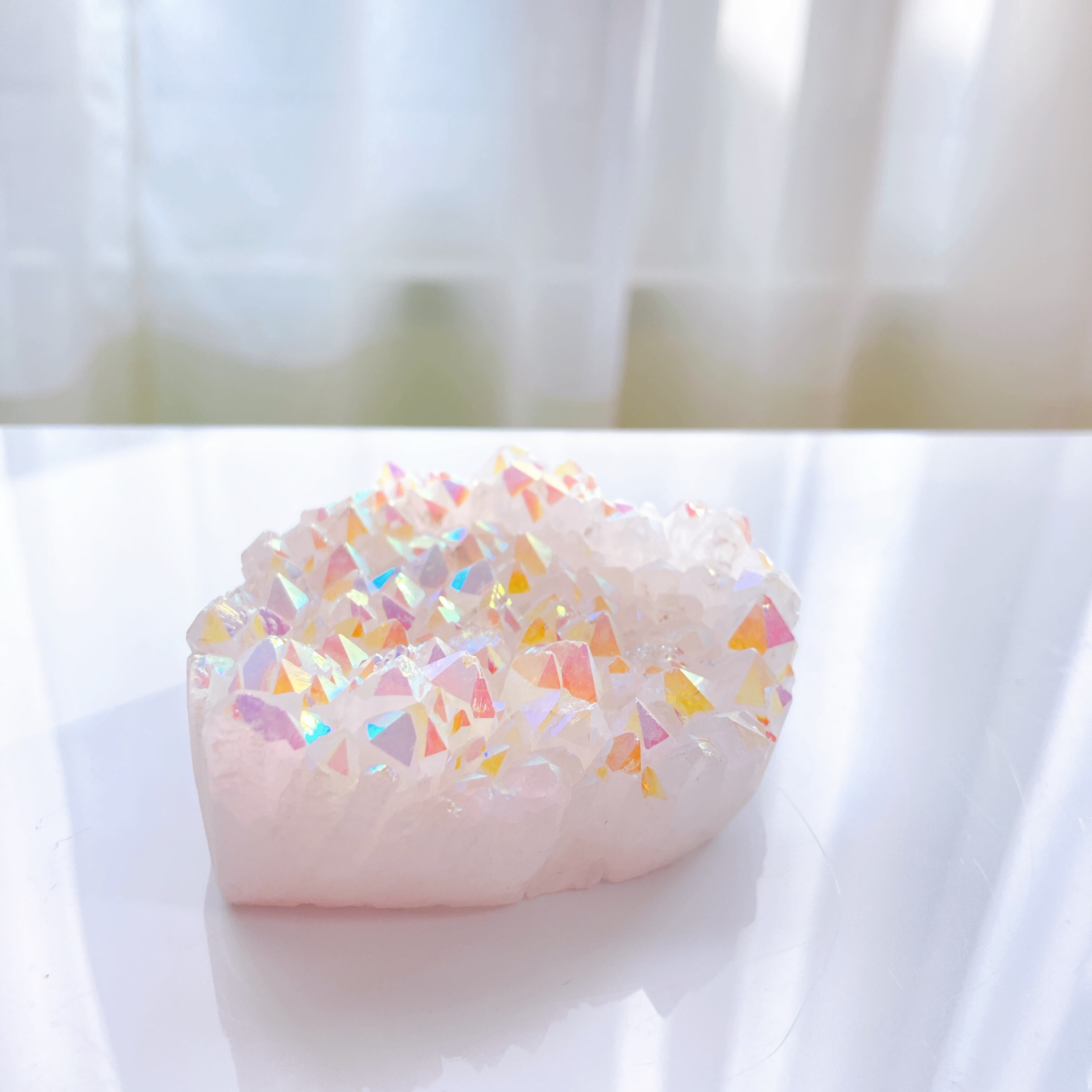 天然水晶に、チタン(銀の場合もあり)を蒸着コーティングする事で作られたものになります。金属を高温に加熱して蒸発させてから、時間をかけて吸着させることで透明感のあるレインボーの輝きが生まれます。