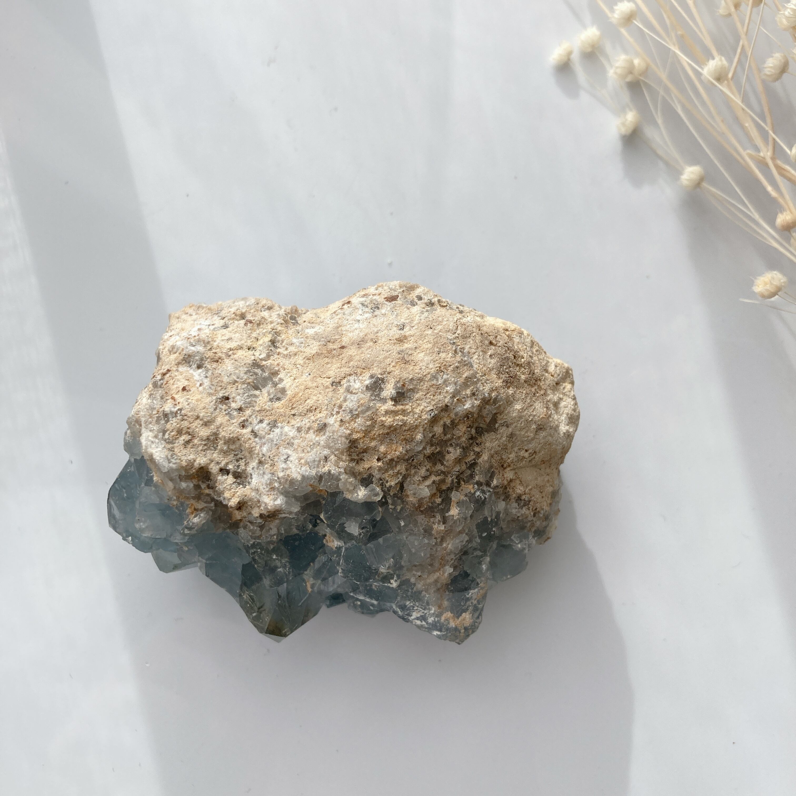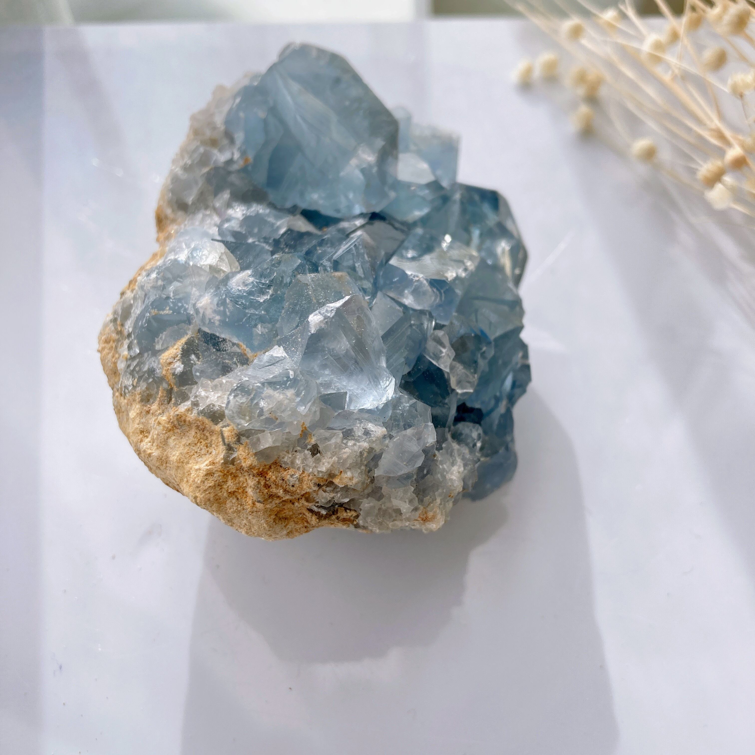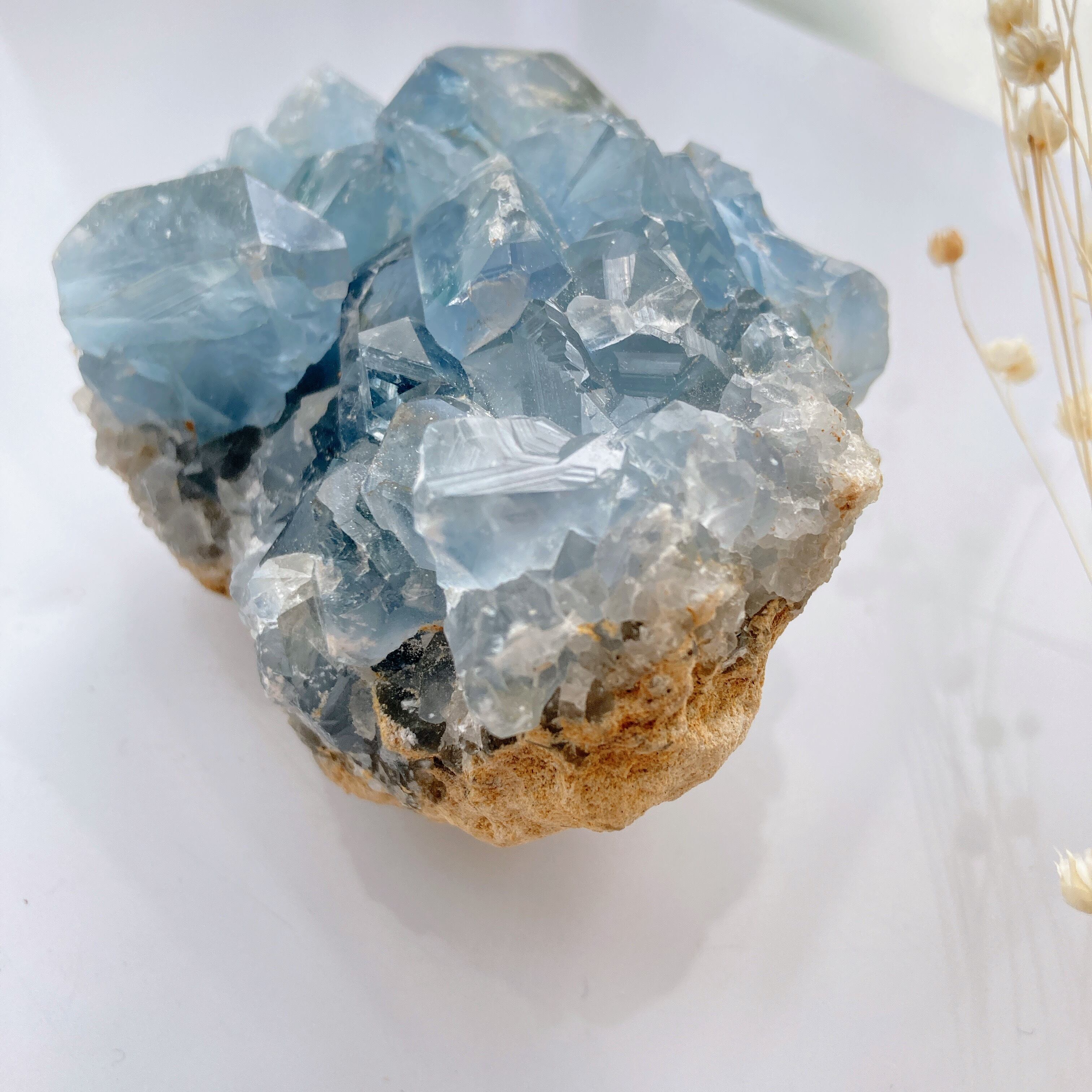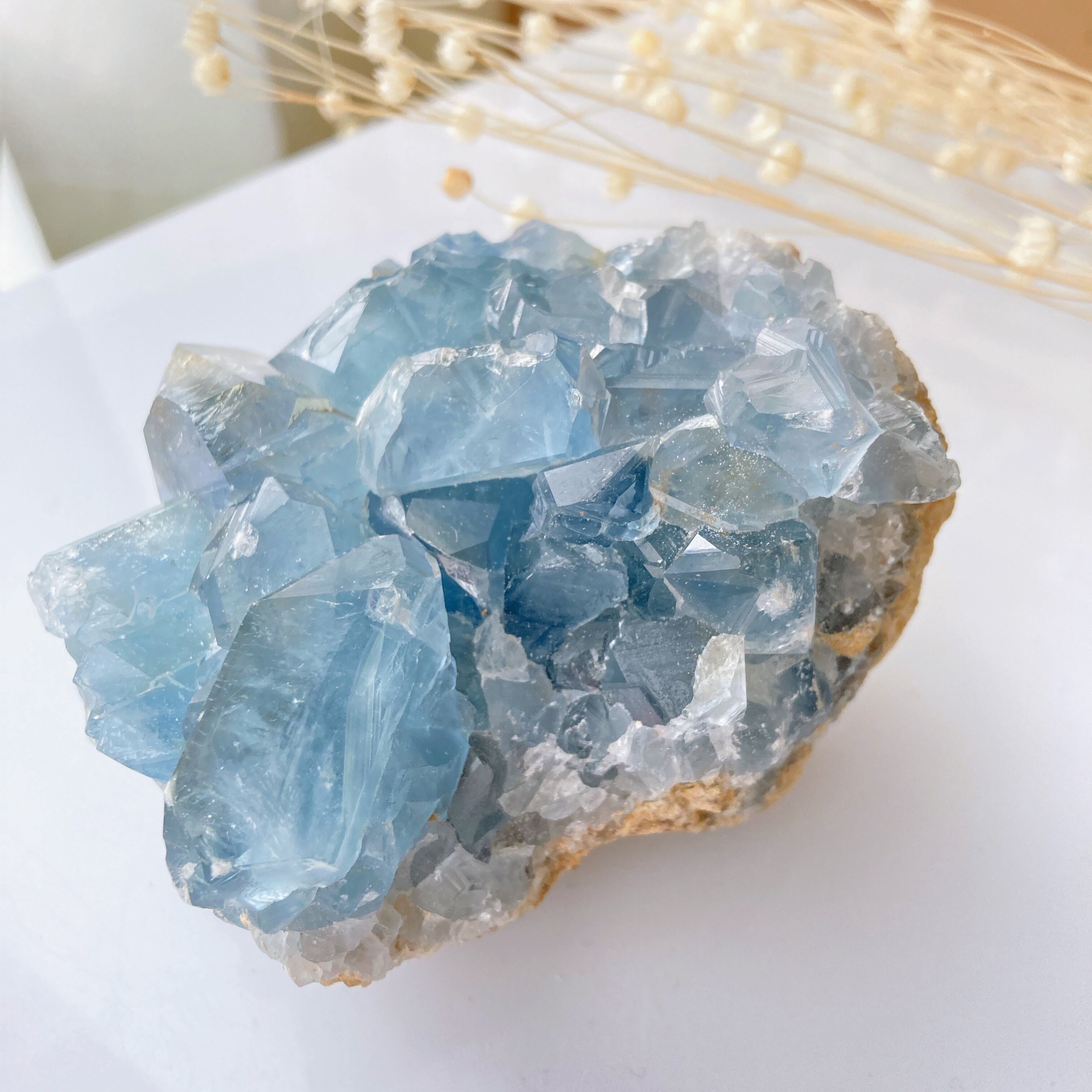 天青石という、青く晴れた空を連想させる和名を持つ、美しいスカイブルーのセレスタイト。ラテン語で「天国のような」という意味も持っています。